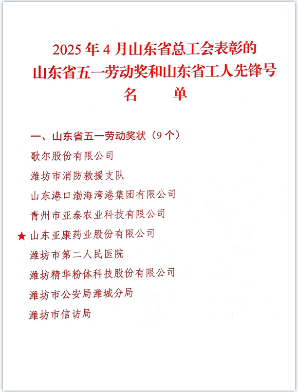 山東亞康藥業(yè)榮獲“山東省五一勞動獎狀”
